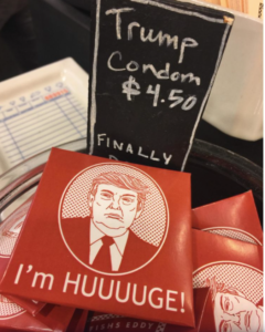 Another image shows novelty condoms featuring Trump’s likeness. Spread out on a table, a sign behind it reads “Trump Condom $4,50.