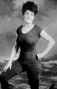 But change was on the horizon. In 1907, Australian swimmer Annette Kellerman became one of the first to challenge these norms when she wore a one-piece suit that revealed her arms, legs, and neck, instead of the then-accepted pantaloons.