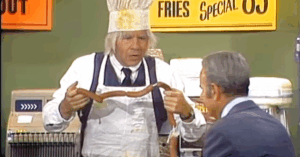 Harvey Korman sits down at a small counter, ready to enjoy nothing more exciting than a hot dog and a chocolate shake. But before he can even get the words out, Conway’s iconic character — The Oldest Man — shuffles onto the scene and instantly derails the entire situation.