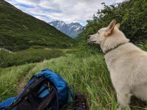The husky, whose name is Nanook, had “guide” written on his collar and was actually a trail guide dog that worked on the mountain finding lost hikers and bringing them back to the trail. Talk about finding the right dog at the right time!